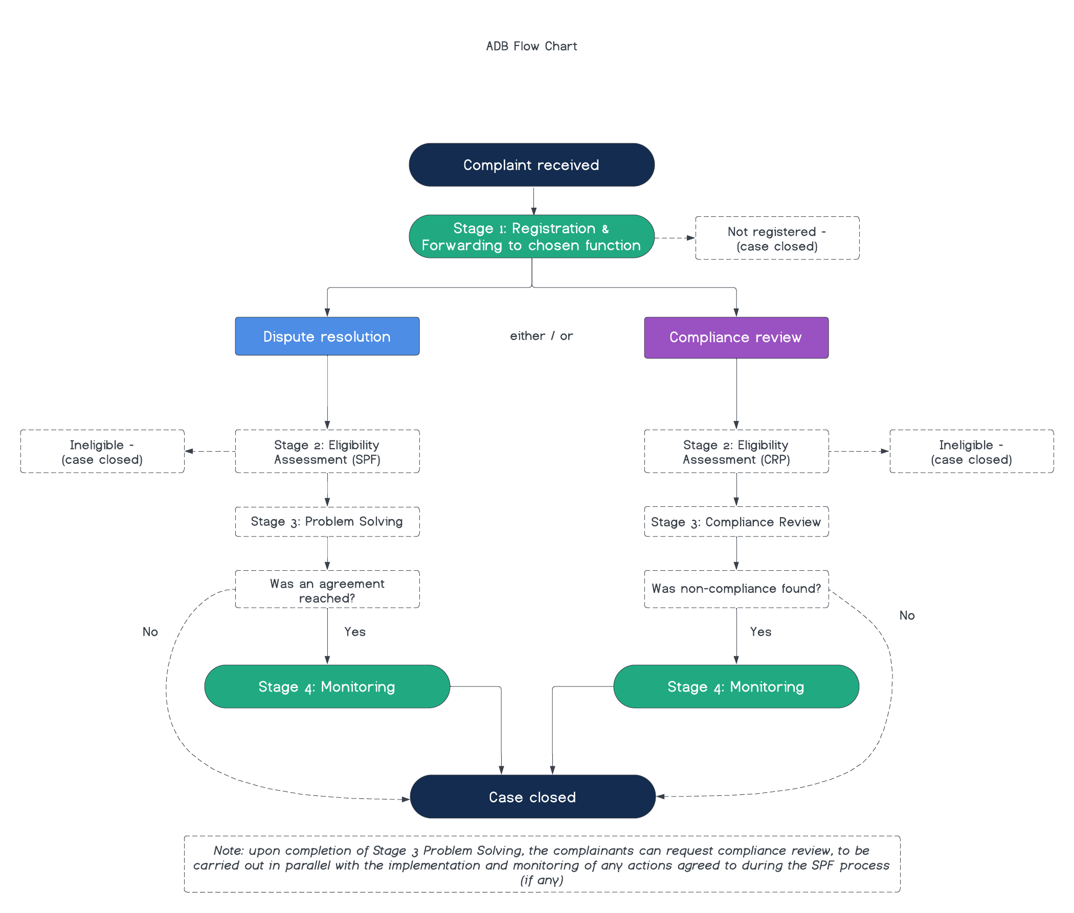 Once your complaint moves forward, it enters the substantive phase: which involves either dispute resolution (known as problem solving at the ADB-AM) or compliance review, depending on your chosen function.