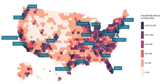 Whenever new infrastructure is built in communities, utilities are repaid at a base rate cost. This means that the increase in electricity usage cost is spread evenly throughout the people who live in that area (Gutierrez, Woody, Smith 2025). Apart from the added costs, although there have been efforts to improve “plumbing poverty,” areas without accessible water, they have not been equitable to people of color since they were the ones who continued to be affected (Meehan, K., Jurjevich, J.R., Everitt, L. et al 2024). With increased cost to utilities and decreased accessibility to potable water, data centers can increase the disproportion among already affected areas, making this a heavier burden to the already-strained, low-income populations. Below is a map of areas where water was not accessible between 2017 to 2021, and these overlap with where data centers are being built in the US (Meehan, K., Jurjevich, J.R., Everitt, L. et al 2024):