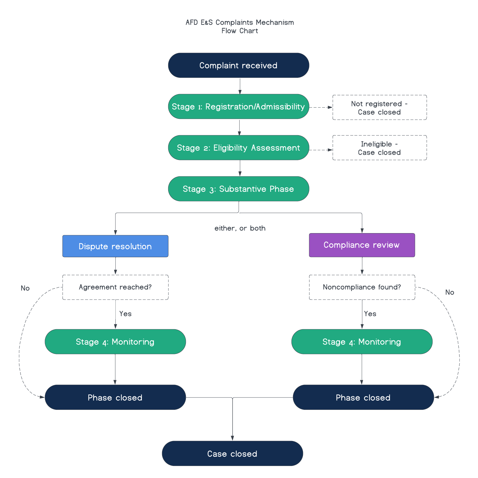 Note, that if your complaint is found to be eligible, the AFD-CM has two functions to try to resolve the complaint: dispute resolution (also known as conciliation), and compliance review (also known as a compliance audit). In the early stages of the complaint process, the AFD-CM will make a proposal for how best to resolve it: through dispute resolution, compliance review, or both. You can learn more about the difference between dispute resolution and compliance review, and which option is better for your complaint on the homepage of this guide.