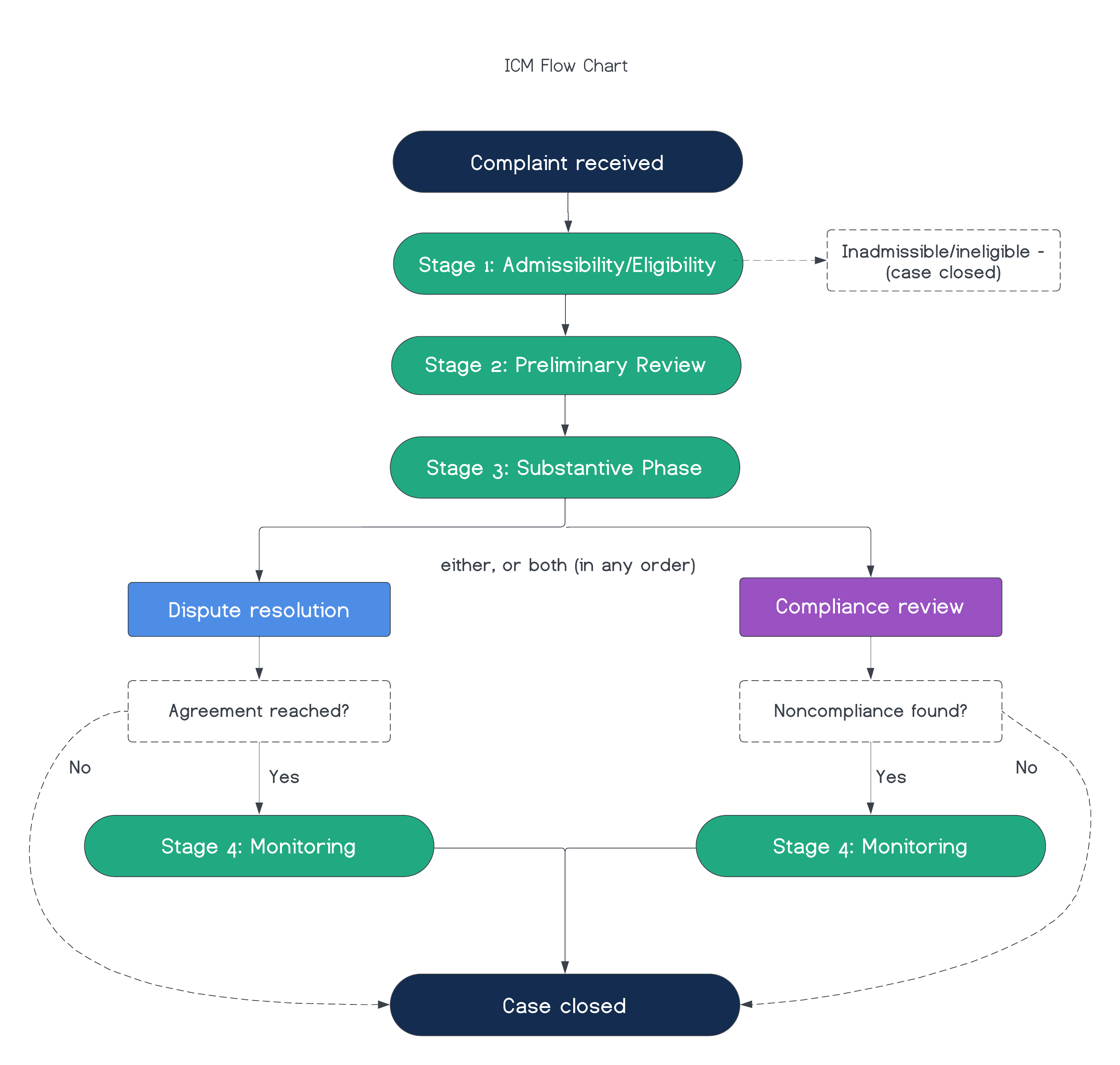 If your complaint is found to be eligible, the ICM has two functions to try to resolve the complaint: dispute resolution (also known as problem solving) and compliance review. You can decide which process you would like your complaint to enter if found eligible. If you want to try both dispute resolution and compliance review, the ICM offers the flexibility to conduct either process one-after-the-other. The two functions cannot be done simultaneously. You can learn more about the difference between dispute resolution and compliance review, and which option is better for your complaint on the homepage of this Guide.
