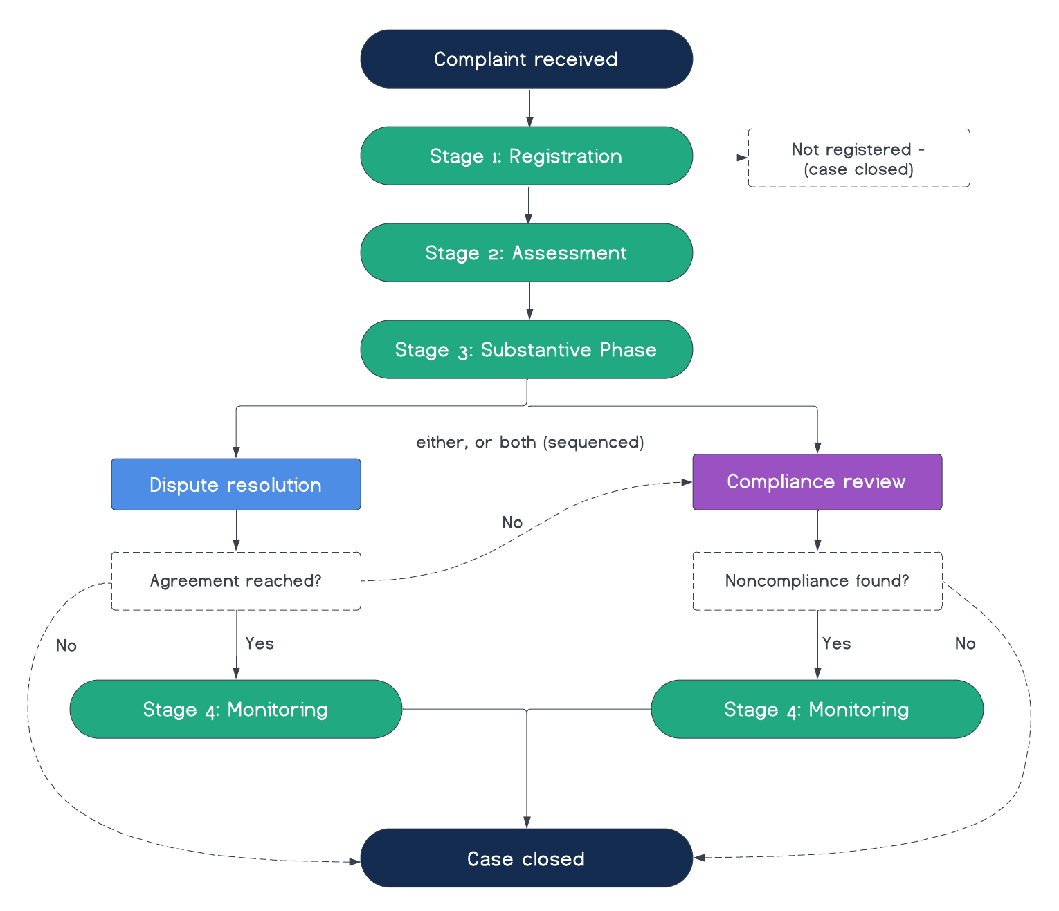 All complaints that have been assessed and not closed should then enter a substantive phase. As mentioned, at IPAM you have the option to choose either “dispute resolution” or “compliance review” as the next step, or do both (with dispute resolution coming first).